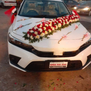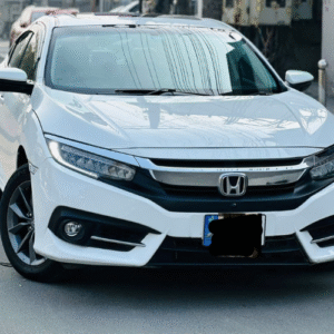 This white Honda Civic features a sporty and aggressive front design with sleek projector headlights and a bold chrome grille. Known for its stylish looks, fuel efficiency, and smooth drive, the Civic is a popular choice among sedan enthusiasts. A reliable option for both city and highway travel with a premium feel.